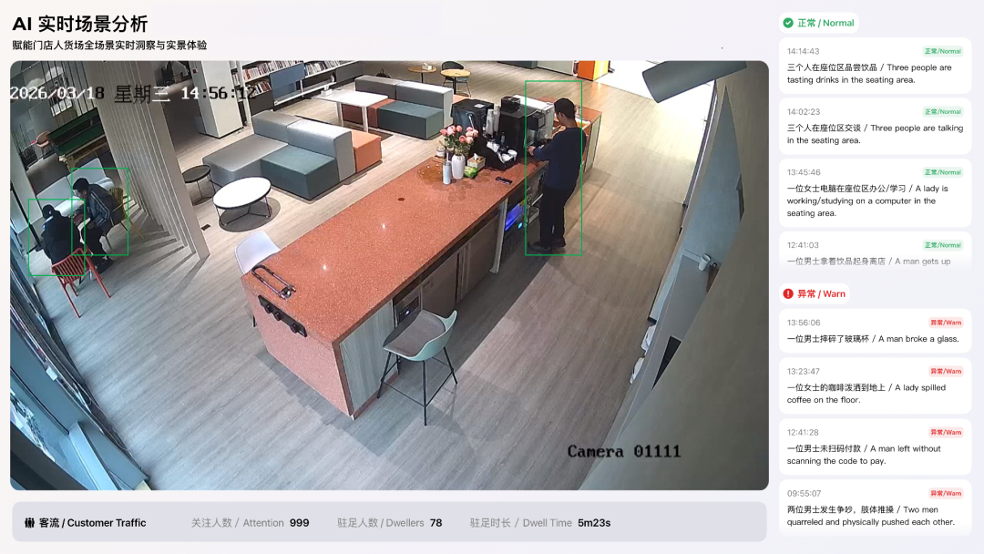 AI大模型,搭载多模态融合事件感知能力,深度解析实时画面中的场景与行为,自动生成清晰动态描述,如“顾客从货架取走商品”。同时精准识别人员跌倒、异常逗留等风险事件并预警。