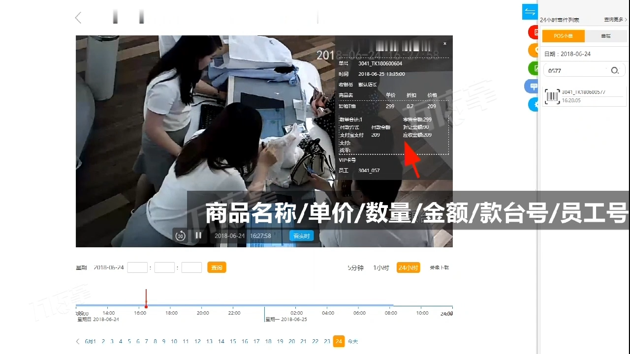 这套智能系统最核心的突破,在于实现了收银交易数据与监控画面的实时同步绑定,从源头牢牢封堵各类收银漏洞。不同于普通监控只记录画面、收银系统只留存数据的分离模式,收银员每完成一件商品扫描操作,系统会自动抓取该商品的全部核心交易信息,包括商品SKU编码、标准品名、对应单价、购买数量、合计金额、当前操作款台号、员工编码以及关联会员卡号等,将这些信息实时叠加在对应收银台的监控视频画面上,做到商品扫码动作、视频画面、交易数据三者一一对应、同步呈现,全程可视化无死角。针对标签篡改这类常见作弊行为,实时显示的官方商品信息能直接完成比对核验,彻底阻断低价套高价的操作空间;针对商品漏扫、误扫等问题,管理人员无论是现场巡查还是远程监管,都能直观看到每一件商品的扫码状态,不用再逐笔核对纸质小票,既能快速发现异常,也能规范收银员的日常操作,减少因疏忽导致的非主观损耗,从前端拦截各类损耗风险。
